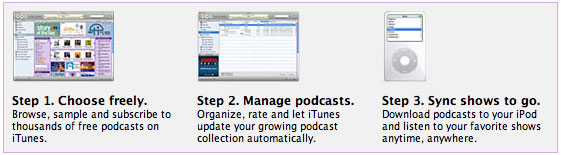 Want to listen to your favorite radio shows and audio and video programs anytime? Just subscribe to the podcasts you want and iTunes takes care of the rest. Updates occur automatically. New episodes appear like magic. Podcasts sync to your iPod as soon as you dock it. Fast. Easy. Free. Podcasts on iTunes. |
